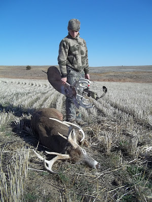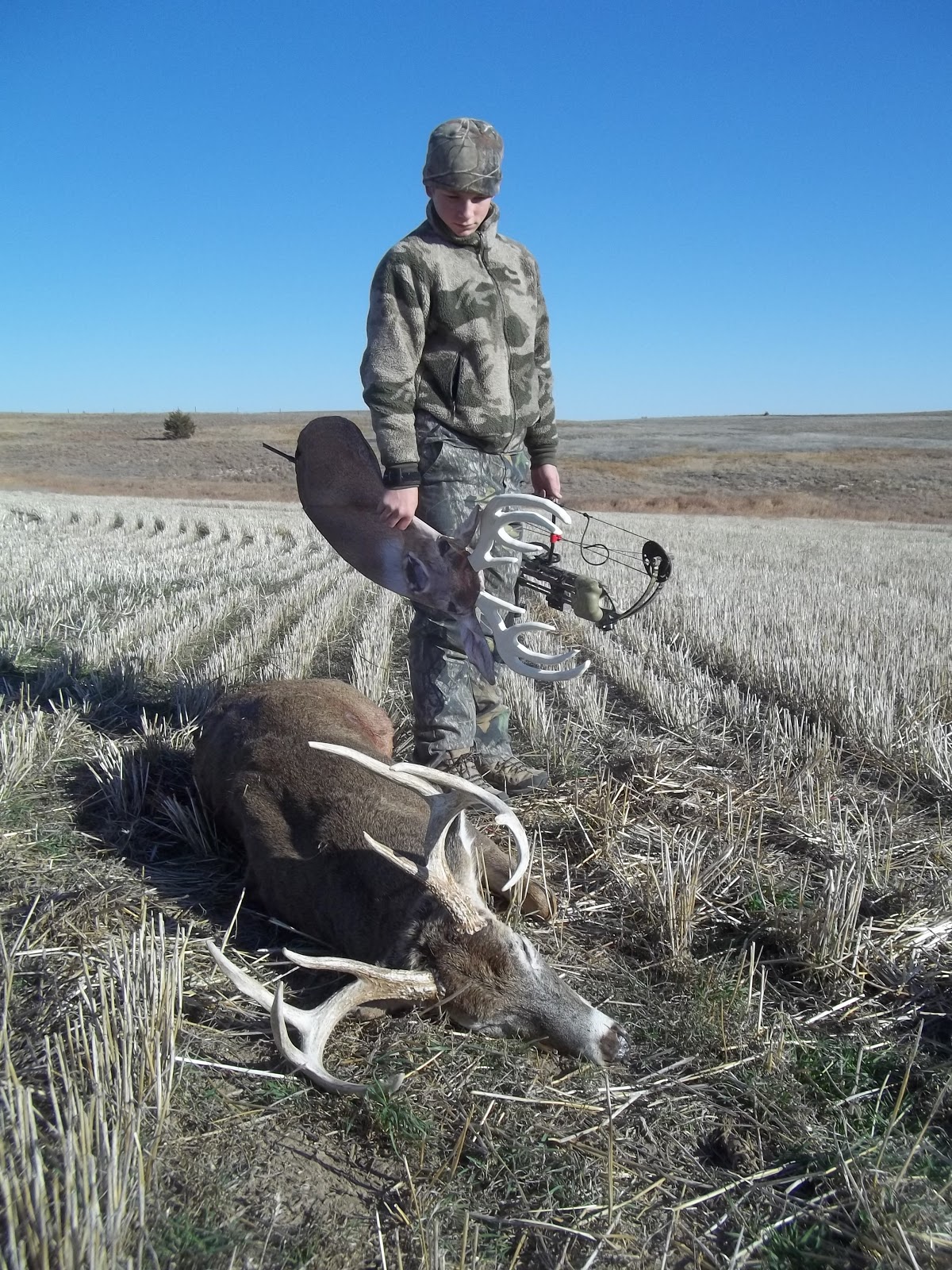 Back to the pickup to head to our original destination, we didn’t make it 3 miles, and spotted another buck tending a doe next to a nice switchgrass waterway in a sprayed wheat stubble field. We glassed them from almost ½ mile away and noticed there was a satellite buck bedded just north of the pair. After a minute or two the buck and doe were bedded in the water way. Preparing for the third stalk, I told Dalton it looked like a 130’s three-year-old and asked what he wanted to do. We were both still a little frustrated about not sealing the deal from the Giant Buck encounter. He said let’s get him. Enough said…. I told Dalton that the satellite buck would see us the entire stalk, to get behind me and we would walk behind the Whitetail Buck HUD to try and get into range of the 3 year old. We closed the distance quickly and soon spotted the bucks antlers bedded 30 yards in front of us. The satellite watched us approach the entire way and was still bedded in the stubble 60 yards away. We moved into the magic 20 yard mark and the doe spotted us. She busted out of her bed with the buck right behind her. The HUD once again proved its value for a prairie deer hunter, as the buck was in disbelief that another buck (the HUD) was standing 20 yards away. They both stopped at 25. Dalton was already drawn and as the buck began laying his ears back, I heard the twang of the string, saw a direct double lung hit and blood instantly spewed from the cut of the 100 grain Magnus Buzzcut. We watched the buck make it a mere 150 yards and expire within seconds.