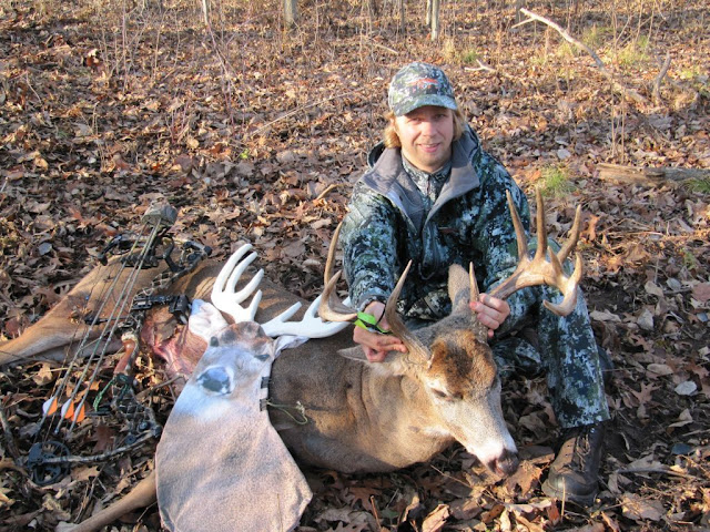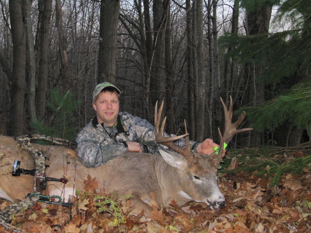 After arriving in the area I had to alter my set-up a little due to the wind. Scouting the day before I had selected a tree that gave me the best set-up to play the wind and do some calling. The wind switched over night and I re-evaluated what I needed to do. Getting the tree picked it was time to position my HUD. I put him in front of me about 17 yards. I climbed the big Oak, and my feet were 31’ off the ground. I was set perfectly on the center of a small Hogback with the ground in front of me dropping and the decoy being about 8’ lower then the ground level of my tree. This was perfect. By facing the decoy I kept the Oak between myself and the direction I expected the deer to come from, help breaking up my outline. With the decoy set, bow hung, it was time to finish getting dressed. It didn’t take long for the birds and squirrels to resume their routine of tweeting, hauling acorns, and going about their business. 2.5 hours later it was time for my first rattling sequence. I turned and faced the tree and readied my shed antlers. After 3 minutes of sporadic antler crashing I slipped them back into my pack…I could feel the anticipation in my stomach building. The gross 170” class buck I killed last year succumbed to the same sequence I just went through, would history repeat? Within seconds it happened, my phone vibrated! I keep it in the breast pocket of my Fanatic Vest. In the calm, still woods, it made me jump. A good friend and his wife were also hunting. He was letting me know it had been slow all afternoon for them, two small bucks cruising was it. Texting him the reply that I hadn’t seen anything yet, I hear crunch, crunch, crunch, crunch….. I knew it immediately. It was that typical buck on the move walk. I knew he was heading for the fight he had just heard. It took mere seconds to pocket the phone, but in that time he had broken into the hardwoods. I reached for my bow and slid it off the hanger, at the same time swiveling 180° to pick him up again. By this point I could see he was already angling away from me and at a steady walk. I was grunting on the tube in my vest as I was re-hanging the bow. By the time I could really give it a good tone, he was out of sight and the leaves obscured any chance that he would hear it. Knowing the typical walk of a mature buck I knew he wouldn’t go more then 25 yards or so before stopping and listening, before resuming his walk. I grabbed the antlers from pack and smashed, ground, and twisted them together for a long enough period I knew I should have had at least two chances for him to stop and hear them. Reaching to drop them back in my pack I spotted him coming at a dead run, he was about 80 yards and closing FAST. Fortunately I was facing my bow and was able to slide it off easily. Ironically he stopped 30 yards away directly under the tree I had been planning on sitting in if the wind hadn’t changed. The set-up was perfect, he was still below the ridge rise and couldn’t see the “deer” he heard. With his ears flared to each side and licking his nose he started the heavy straight legged walk directly toward me. It still amazes me how these animals can pinpoint a sound. He heard that rattling from over 100 yards away and was now walking directly towards me at less then 30 yards. All I could do was face the tree and hope he gave an indication which side he would pass. If I picked wrong, he would likely survive. I knew he was a shooter with a lot of points, but had no idea exactly what was coming at me. At 8 yards he came to a small downed tree, he elected to circle it instead of jumping it. This enabled me to get to the left side of the tree, and it opened up his vision…he spotted the HUD buck now a mere 20 yards away. The ears laid back, hair bristled, and the sideways walk started. He was 4 yards from the base of my tree, in the wide open. Being fixated on the decoy, I knew I could get away with drawing. Settling in on him, I voice grunted him to a stop, as his head turned upwards our eyes locked and I touched the trigger. The arrow zipped through him; he looped 50 yards back and tipped over in plain sight. I was a wreck. As the arrow flashed through him I finally noticed the row of tines that lined his close main beam, as he ran off I seriously began to fall apart. I hung my bow up and sat down. I don’t drink, but the list of friends that I texted at that point had to think I was drunk. It was the most unreadable incoherent message I have ever seen. On my descent down the tree I was overly cautious as I knew that I was a mess. Once I was on the ground I called my dad and gave him GPS coordinates to where I was. My lifelong hunting partner would be waiting at my truck in an hour. I had 20 minutes of extra time to spend with the deer. Walking up to him as he lay motionless was bittersweet, awe-inspiring, and emotional all wrapped into one. I was able to sit beside him, lift his rack, give thanks for everything, and best of all just soak it in. This past weeks’ events at Sandy Hook have made me more appreciative of things in life and have me that much more excited to get my anxiously waiting 10 year old on his first hunt in a couple months. My thoughts and prayers to everyone involved in this senseless tragedy.