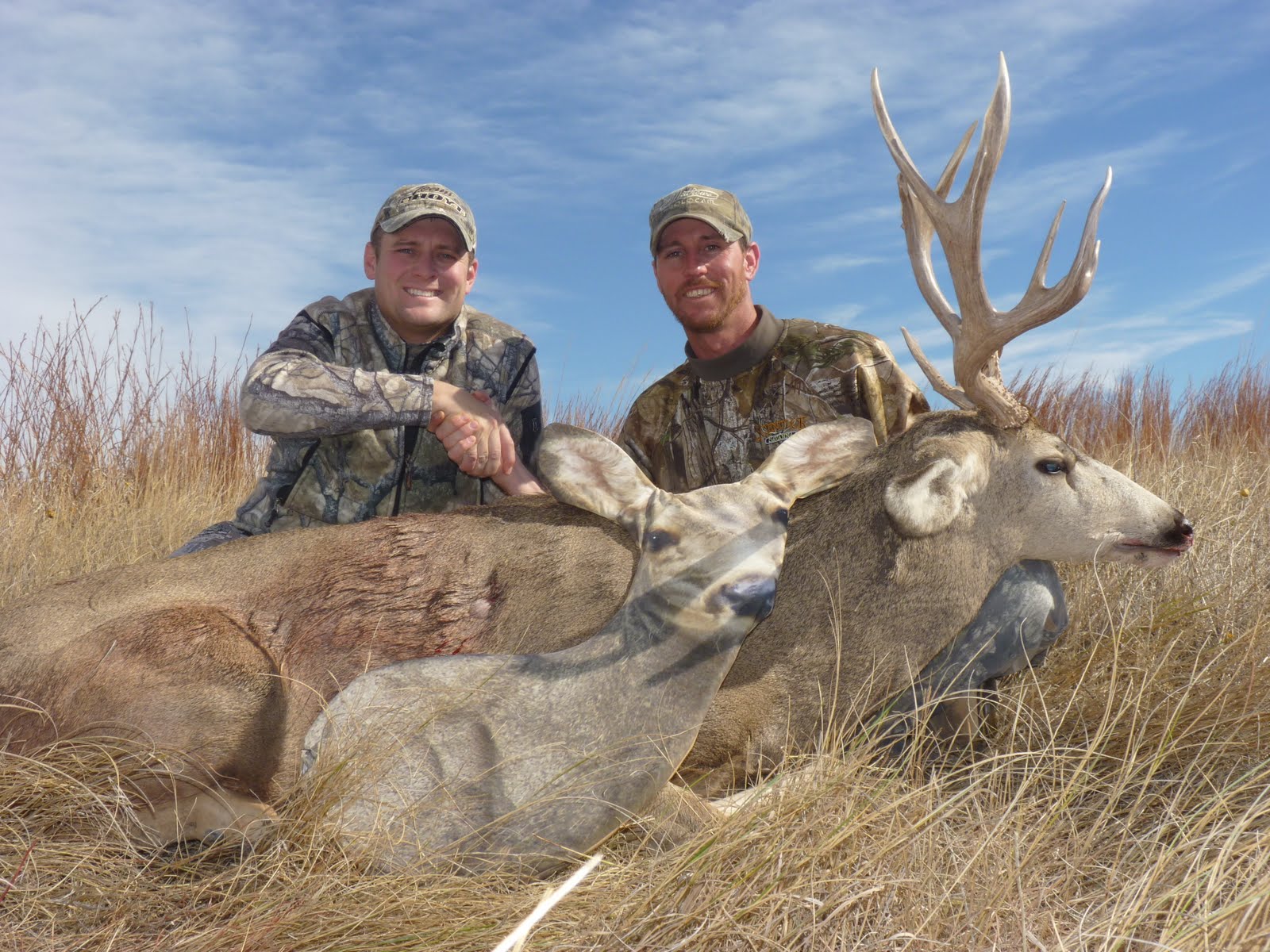 After a few failed attempts, we decided to head to a new location Saturday morning. We found a large group of does with multiple bucks strung out along a weedy fenceline between a crop field and a large CRP field. The wind wasn't cooperating because it had all but died, but we watched the deer bed and decided to give it a try. We used the mule deer doe decoy to help cover our approach. As we approached there were multiple small bucks chasing does around the tall grass between us and the target bucks. We slowly made our way towards their location. Every once in a while I would look all around us to make sure that a buck hadn't snuck in behind us. I couldn't believe it when I spotted a mature buck parallel with us about 300 yards away. While Jason sized him up, the buck was extremely nice and bedded down. Jason made the decision to pursue the new buck and the hunt shifted gears. We crawled through the grass using the decoy to shield our movement. The buck had glanced our way a time or two, but paid no attention to us. We held up when we were 40 yards from the bedded buck and decided that was far enough. I think we could have got even closer, but we didn't want to push the envelope. The buck laid his head down for awhile and when he lifted it to stretch I raised the decoy up high. The buck locked onto the doe decoy and stared at us for a minute or so before casually rising from his bed. Jason took that opportunity to draw and the buck stood broadside allowing him time to settle in. Jason made a great shot and had accomplished his goal of tagging his first mule deer! It was an awesome hunt that neither one of us will soon forget!