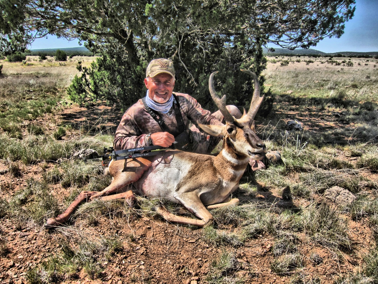 It was now Thursday and our 4th day in the field. We had decided to work an area where we have seen some great bucks and also heard of a great one in particular known as Unicorn. We were told he has one solid, normal horn and a deformed horn growing along side of his face. We started out glassing up a few does but couldn’t turn up a buck so we moved on. We were heading to an area where we had seen the most sign from previous scouting trips. It wasn’t long until picked up a single and it was a great buck. We didn’t study him too hard but knew that he was a shooter. The plan was to get above him in the junipers and work toward him. We started moving to where we saw him last but at a slow pace, glassing and picking every little bush apart. Finally, we heard him grunt and quickly picked him up. He was moving through the trees and unaware that we were there. Once again the wind was in our favor so we became very aggressive to try to get in to position to decoy this buck. Before we knew it we were there. The buck was 80 yards and moving at an angle that would present a shot. Ken knocked an arrow and I grunted to stop the buck while showing him the decoy. The buck stopped and locked on to the decoy, I gave Ken the yardage, and he released his arrow. The buck was hit well! As I glassed the running buck I told Ken “You just shot the “Unicorn Buck”! We were both in disbelief that he just took one of the notable bucks in this area. We were able to watch this buck fall inside of a 100 yards. As we approached him we couldn’t believe the mass and character that this buck had. We also saw the deformed side was growing down and into the side of his face. He ended up with a gross score of 72 4/8” Pope & Young points even with his goofy horn. If his deformed side was equal or close to the good side he would have grossed right at 80” Boone & Crockett minimum!