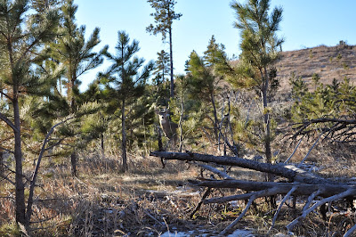 Just like a ghost emerging from the darkness; a doe erupted from the timber and ran into the meadow about 200 yards away. Something had to be pestering her. Just then a nice buck emerged with his nose pressed to the ground. He was a dandy 5 point for this area and very conducive for a closer look!