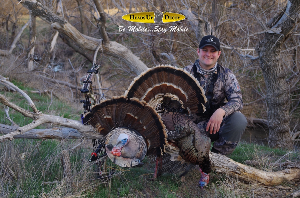 distance. This resulted in several hikes that netted very few sheds, but it was still great to scout for sign. Several late snows kept me out for a while and allowed the deer to drop their antlers without being disturbed. I was anxious to get back a field, but the time off paid in results. Several short trips resulted in 20+ antler days, which always makes it more fun!!There were still plenty of antlers left throughout the prairie, but when April finally arrived my focus was turned towards chasing love sick gobblers with my Heads Up Decoy! I was lucky enough to hunt with my brother Lucas and my nieces and nephew for the opening weekend. High winds resulted in tough hunting but we were able to use the HUD to fill a couple of tags before the weekend was over. We had to work for every opportunity we got. The birds weren’t very aggressive yet so we spent most of the time crawling towards the birds hoping to get a response. I was lucky enough to find a group of toms that were ready to challenge the encroaching turkey and arrowed my bird at 10 yards with the HUD in my bow mount. Talk about a rush!!