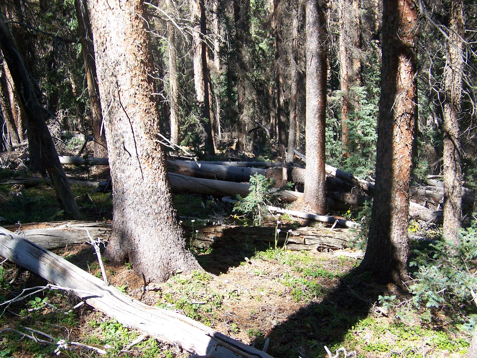 After a 3 mile hike into an area it was apparent that no one would be in there. There are people that are happy about the Colorado beetle kill, but it's a tragic picture in reality. I would say that in the area we hunted, 1 out of 20 pines were living. It was a tangled mess of deadfalls.
