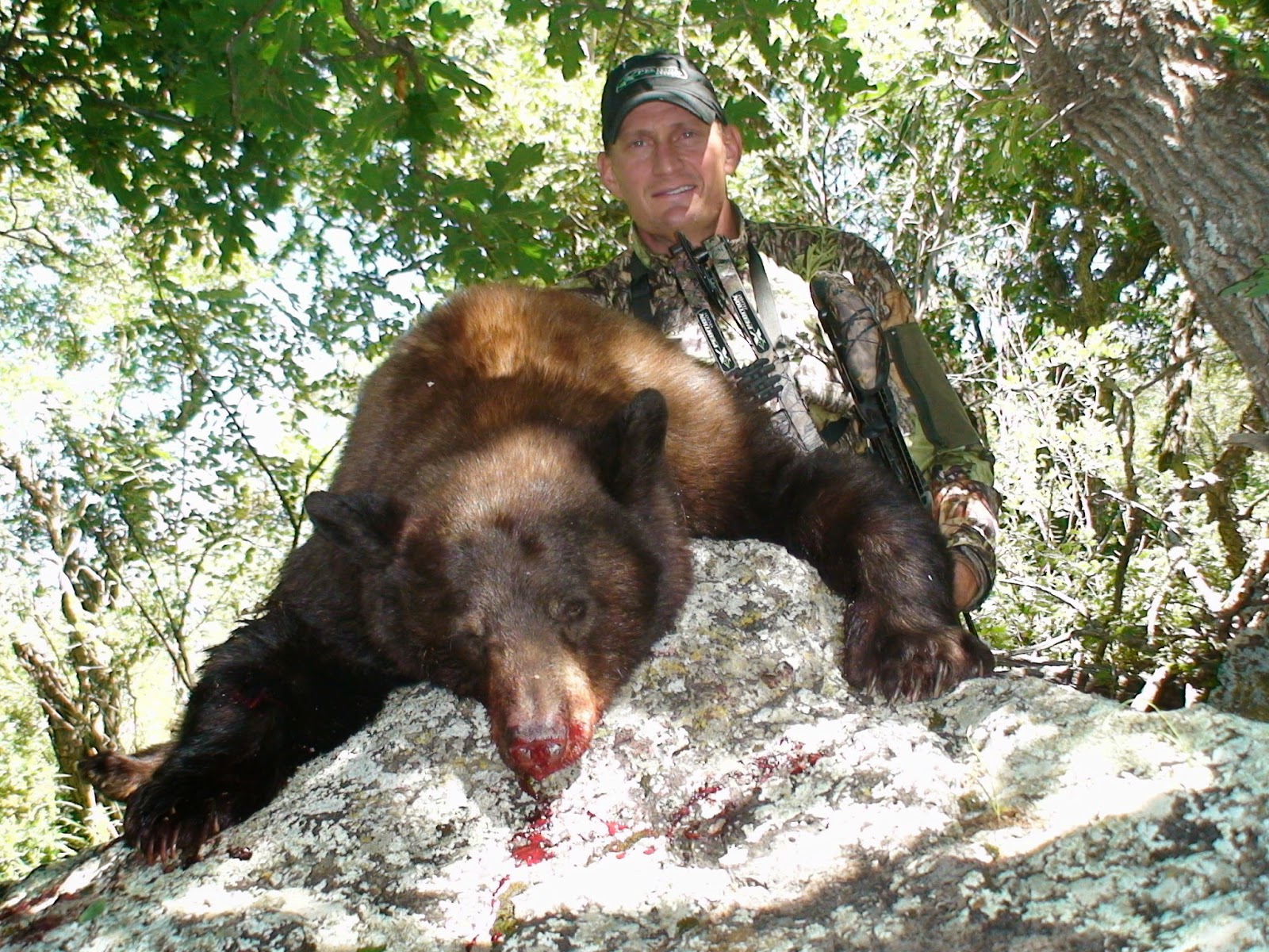 We advanced along our predetermined route and came to our final landmark. Doug was armed with the video camera; I was armed with my new Xpedition Archery killing machine. As anticipated, I moved slowly around a final tree to find the big bear its original location. With film rolling, my first arrow sailed harmlessly under the bear’s chest (most guys would have probably used a rangefinder in this situation. I’m a knucklehead sometimes). The clatter of the arrow through the trees below caused the bear to ignore the task of eating and look around for the cause of the commotion. My second arrow found its mark and the bear instantly fell out of sight into a tangle of oak brush. As with many of my attempted video kills, the entire sequence wasn’t captured on camera; Doug was busy watching the action and filming the ground at his feet (easy to be distracted after stalking to within 30 yards of a bear!). We sat for an hour, uncertain of the exact location of the hit. Neither of us relished the thought of tracking a wounded bear through this thick, tangled mess. Our bull sounded-off a few times to let us know he was still there, almost taunting us in the process.