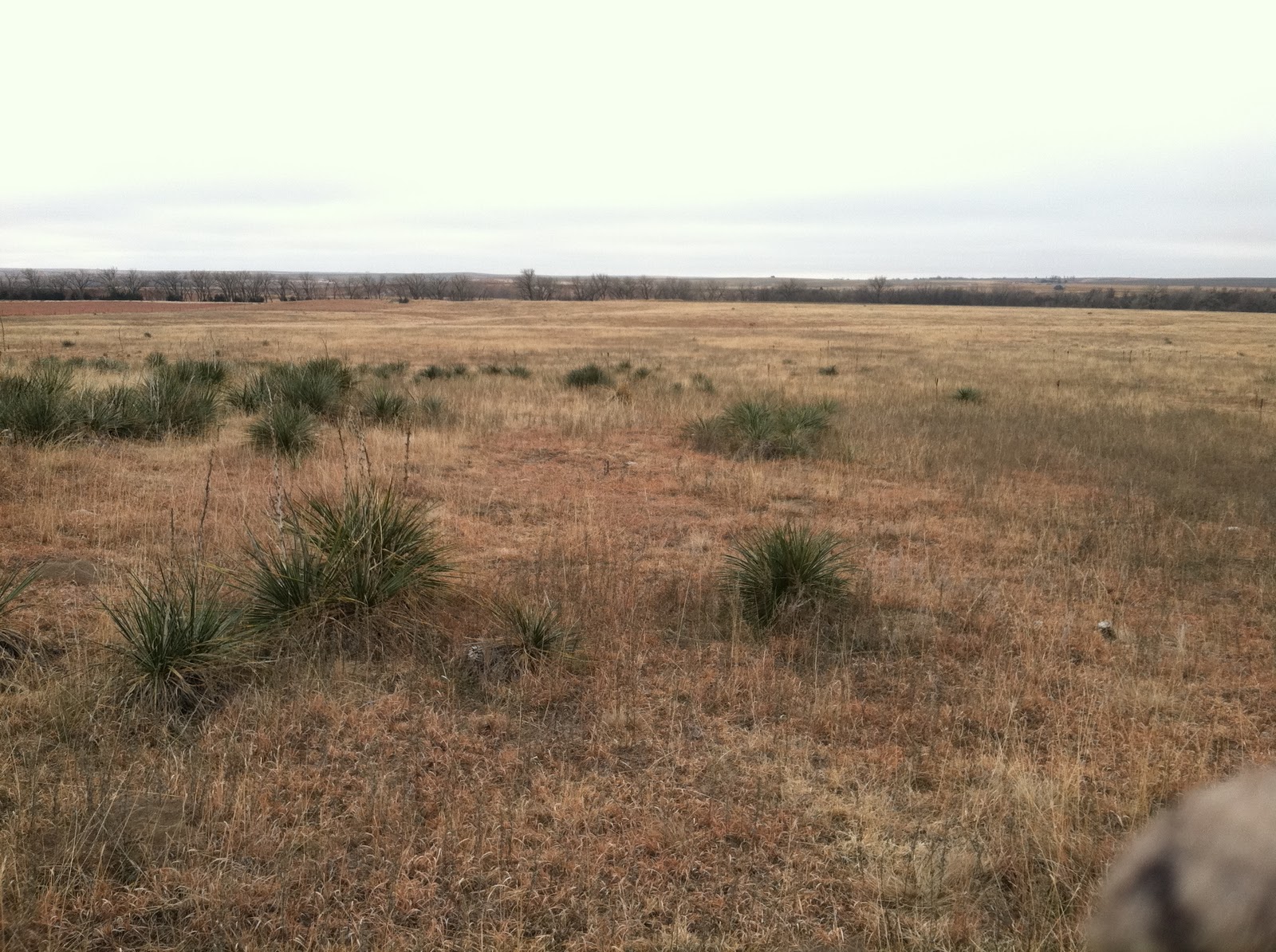 Low light found me in position and scanning the pasture for movement. It wasn't long before I was able to see a buck in the distance working his way up the fenceline in my general direction. It was not shooting light, but it was enough for me to pick up the movement with my binos. Not being able to truly assess the size of the buck, I decided to move to the ridge closer to his position to get a better look. I found the buck moving off to the east and not worthy of a 1/2 mile pursuit. I felt good about my position and I elected to "hole up". There was a winter wheat field on my north that I was banking on holding a rutting buck and being downwind of the bedding area with plenty of cover, I liked my chances...1/2 mile from any tree that could hold a treestand.