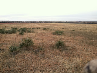 My place of "hiding" the buck came just inside the small far right upper yucca...30 yards. |